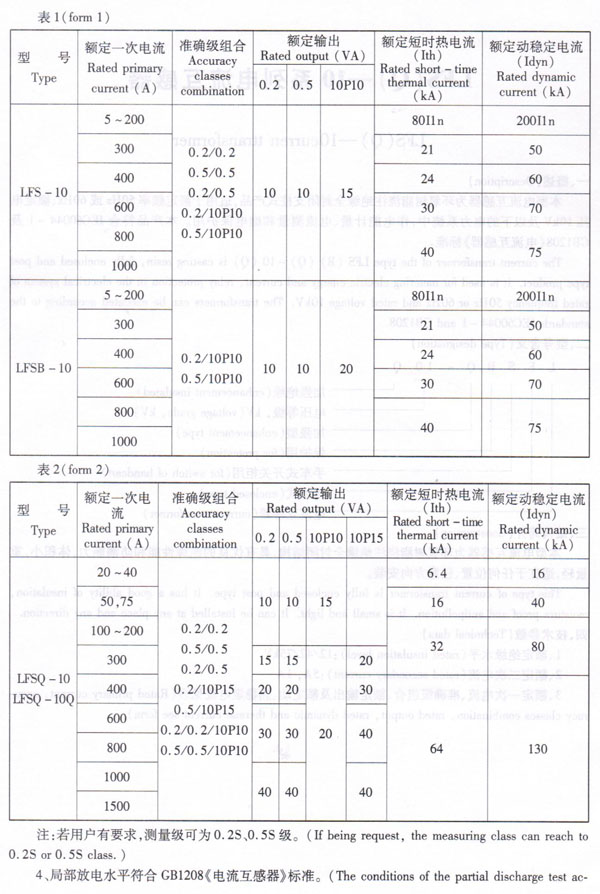 3、Rated primary current, accuracy classes combination, rated output, rated dynamic and thermal current see form.