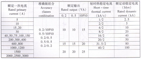 3、Rated primary current, accuracy classes combination, rated output, rated dynamic and thermal current see form