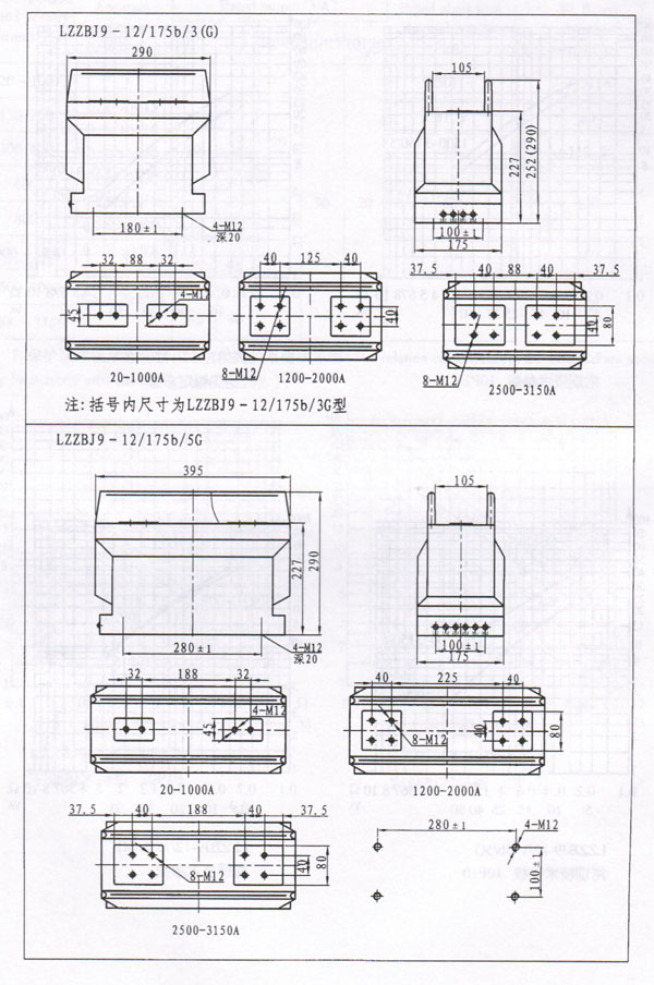 三、ConstructionThis current transformer is fully enclosed and post type. It has a good ability of antipollution and moisturepmof. The outline of the product can be made according to three drawings. If being instal_led, the terminal screw must be fixed tightly. It have four 4 - M12 mounting holes in the bottom of casting body.