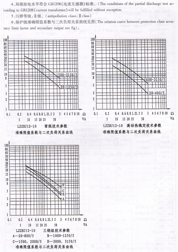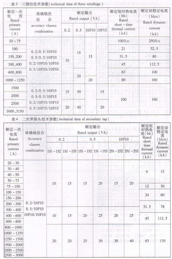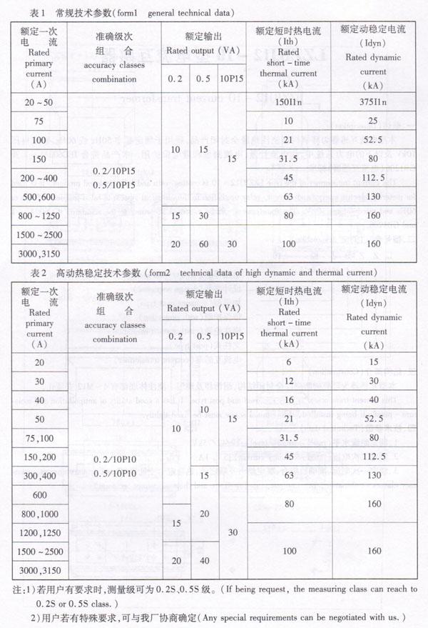 3、Rated primary current, accuracy classes combination, rated output, rated dynamic and thermal current see form: